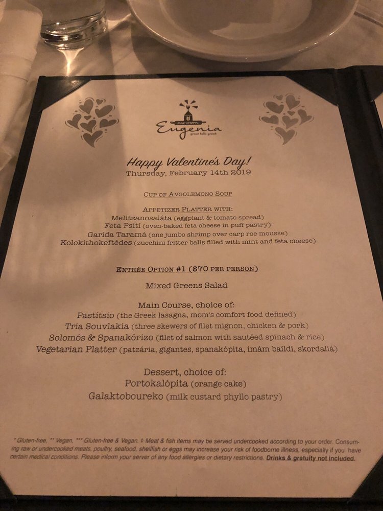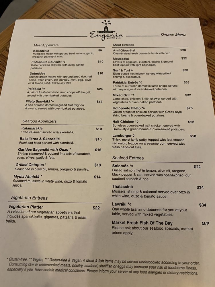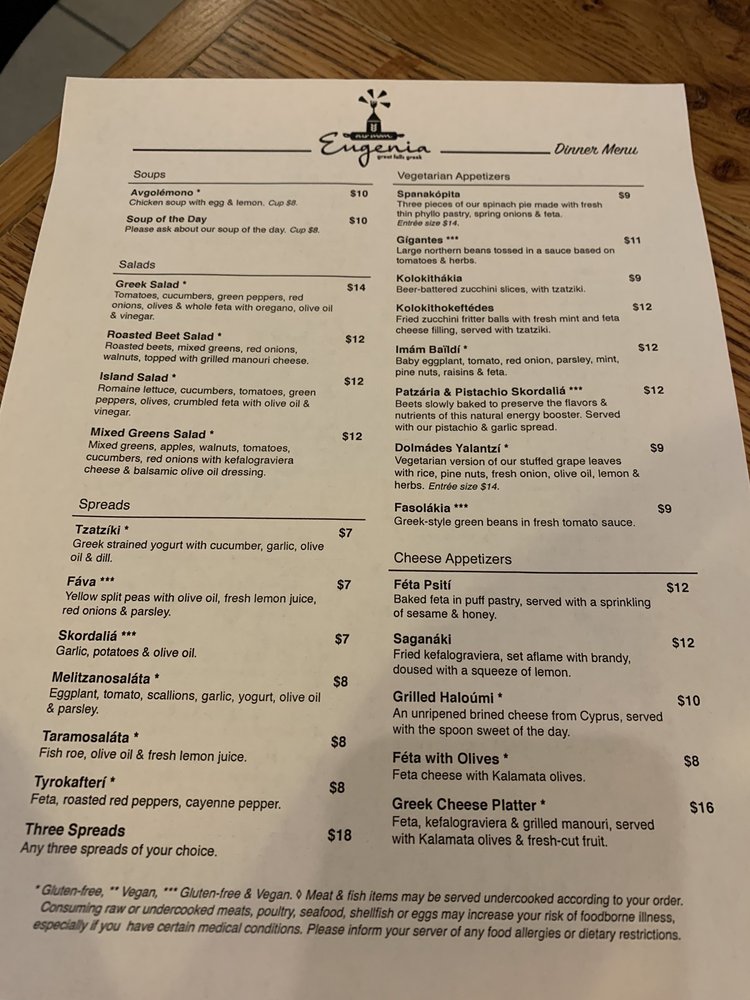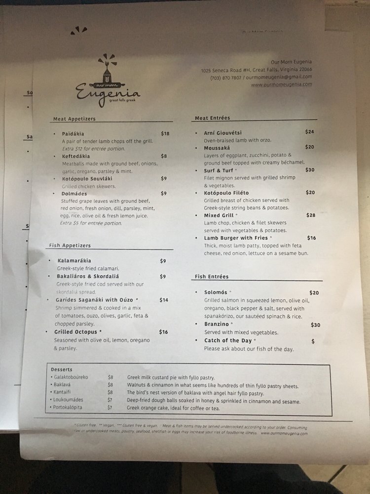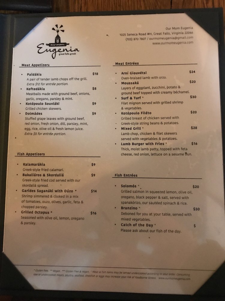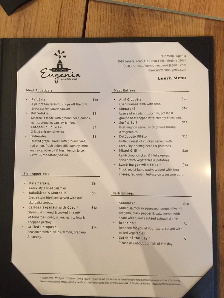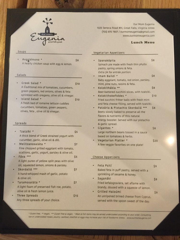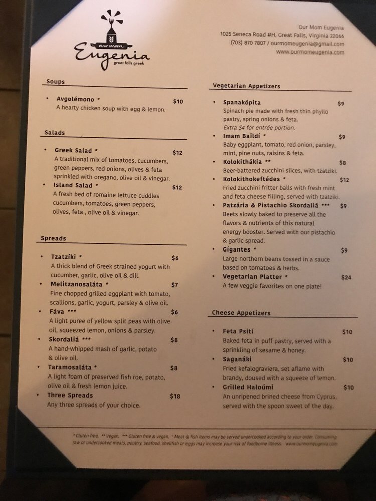 Introducing the menu at Our Mom Eugenia - Great Falls, a classy restaurant with a variety of options for different dietary preferences. Offering a range of soups like Avgolemono Chicken soup and a selection of salads such as Greek Salad and Mixed Greens Salad, this place caters to Pescatarians, Vegans, and Vegetarians. The spreads like Tzatziki and Tirokafteri add a unique touch to the dining experience. Customer reviews rave about the freshly made bread, delicious appetizers like meatballs and chicken souvlaki, and the exquisite pasticchio. With exceptional service and a welcoming atmosphere, this gem in Great Falls is praised as one of the best Greek restaurants in the area. The crispy Branzino and flavorful dolmades are standout dishes that continue to impress patrons, making each visit a delightful culinary adventure.